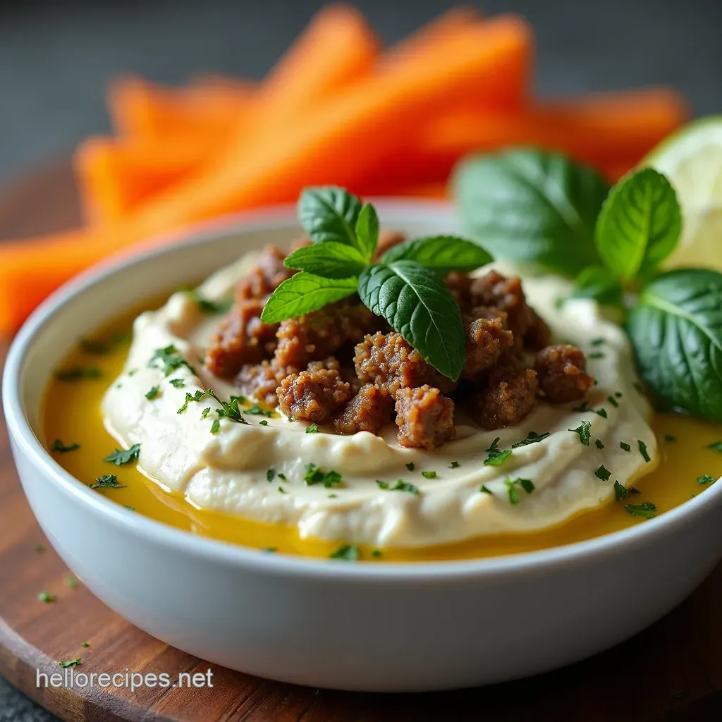 Presentation is key, innit? Spread that mint labneh dip artfully on a plate. Spoon the warm, spiced beef mince dip over it.