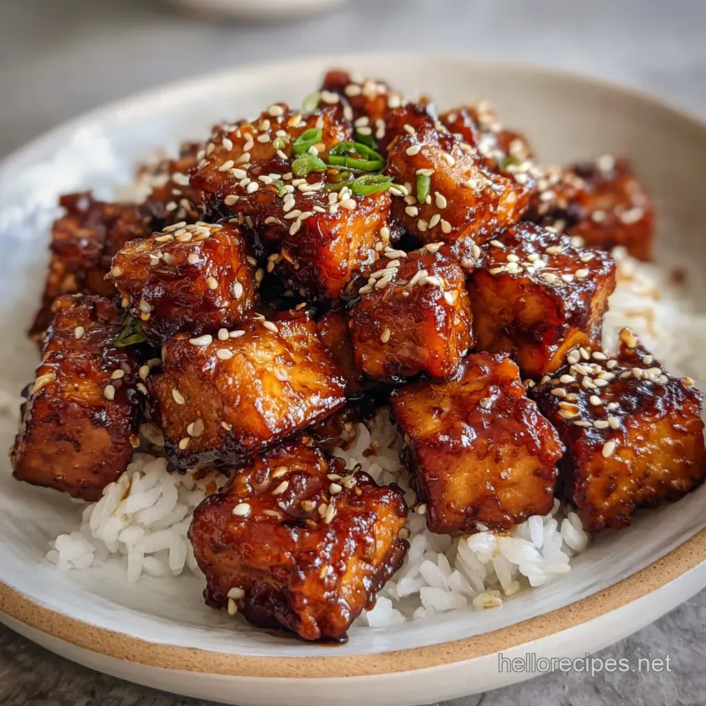 Use a "stacking" method rather than spreading the tofu out flat. Pile the cubes in a small mountain and let the extra glaze drizzle down the sides. Finish with a heavy dusting of sesame seeds from a height this ensures an even distribution and looks great for the "gram." If you're feeling fancy, a few curls of fresh red chili can add a final splash of color that signals the spicy sweet flavor profile waiting inside.