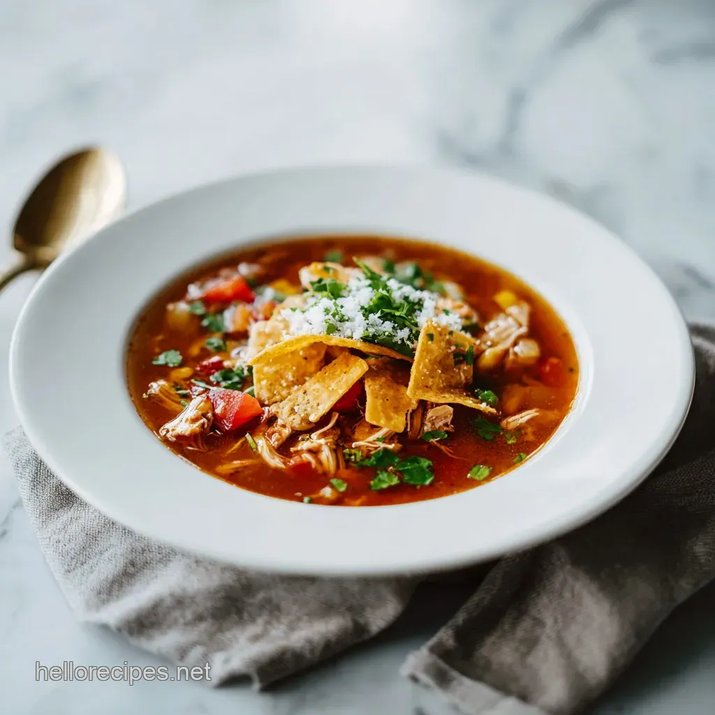 The Starch Thickening Hack: Adding 4 crushed corn tortillas at the end isn't just for taste; the corn masa breaks down and acts as a natural thickener, giving the soup a velvety body.