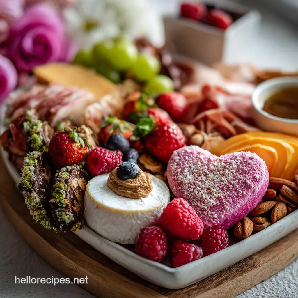 Focus on romantic shapes, colors, and complementary flavors. Include heart shaped cheeses, red fruits like strawberries and raspberries, dark chocolate, and cured meats like prosciutto or salami folded into roses.